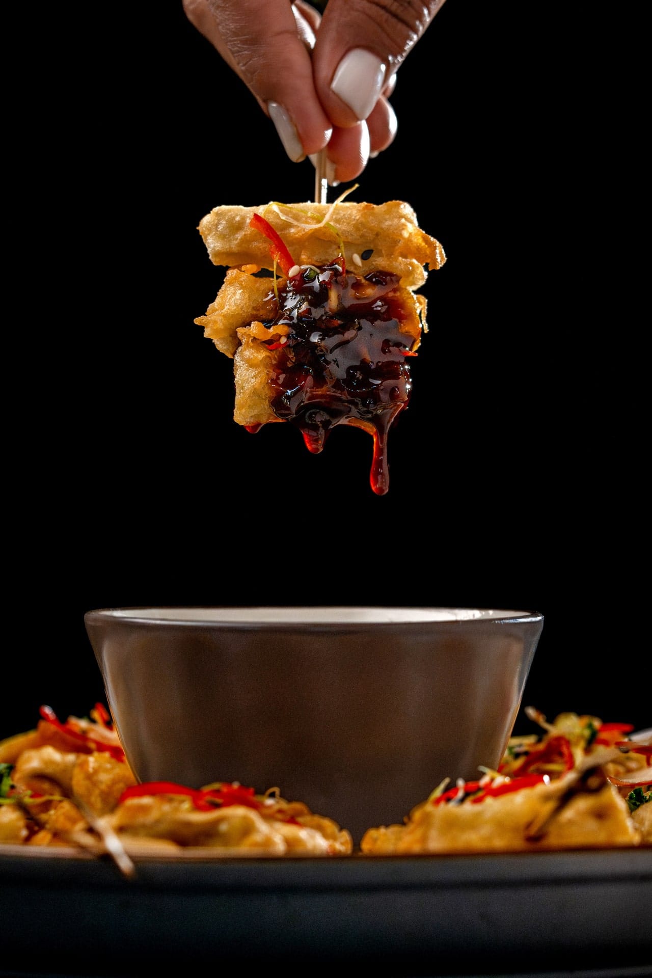 crispy tempura eggplant,shanghai sweet sesame sauce.